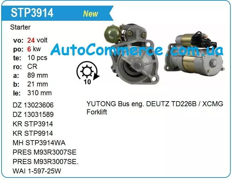 Стартер M93R3015SE на автобус YUTONG (Ютонг) з двигуном DEUTZ TD226B, WP6. виготовлена з дотриманням усіх вимог якості автовиробника YUTONG (Ютонг). Швидко та легко встановлюється на автомобілі.